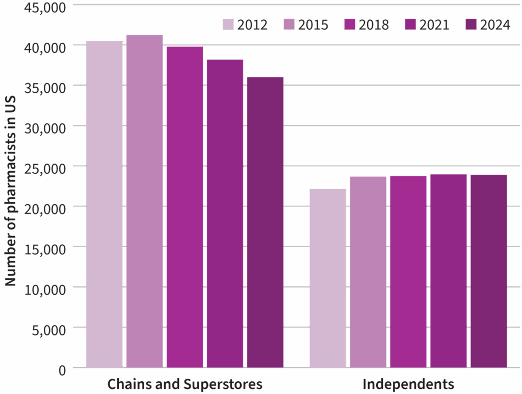 The graphic below shows the number of pharmacies from 2012 to 2024 for two categories of pharmacies. On the left are chains (CVS, Walgreens, etc.) and superstores (Walmart, etc.). It demonstrates the point above in that the number of chains and superstores has fallen by approximately 5,000 over this time span, while the number of independent pharmacies has risen slightly.