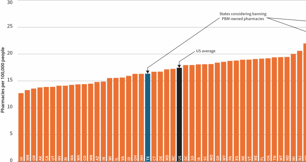 States considering banning PBM-owned pharmacies are near or above the national average for pharmacy access. The graph above shows each state’s number of pharmacies per 100,000 people. The three states considering banning PBM-owned pharmacies are New York (second highest), Arkansas (fifth highest), and Texas (slightly below the US average). Pharmacy access does not seem to be the driving motivator here.